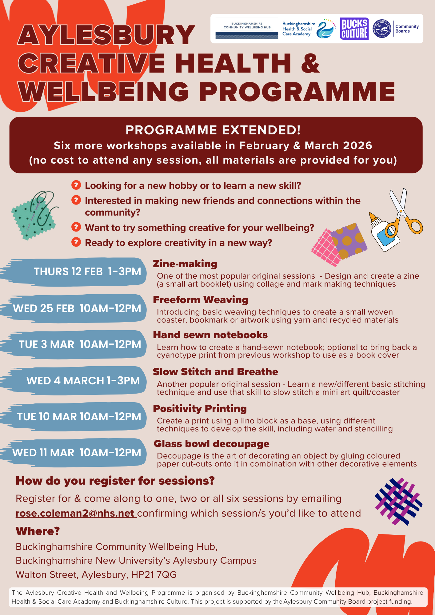 BCW Hub, in partnership with BHSCA and Bucks Culture have piloted a free programme of creative health and wellbeing sessions in Autumn 2025 and Winter 25/26 aimed at promoting the health and wellbeing of local residents. This pilot is supported by project funding from the Aylesbury Community Board and more on the project is available below. The final sessions are now available for booking!